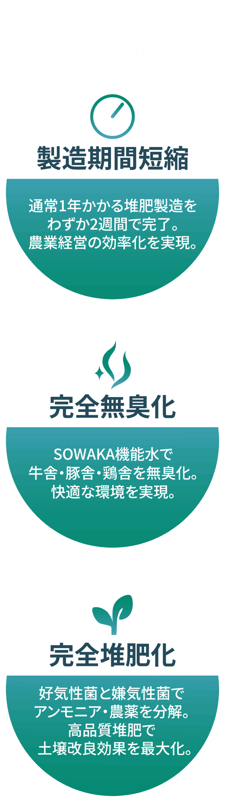 通常牛糞・豚糞・鶏糞など有機物、残滓物は約1年かかりますが、SOWAKA処理すると2週間~1カ月で堆肥化が可能。しかも完全無臭堆肥になります。
